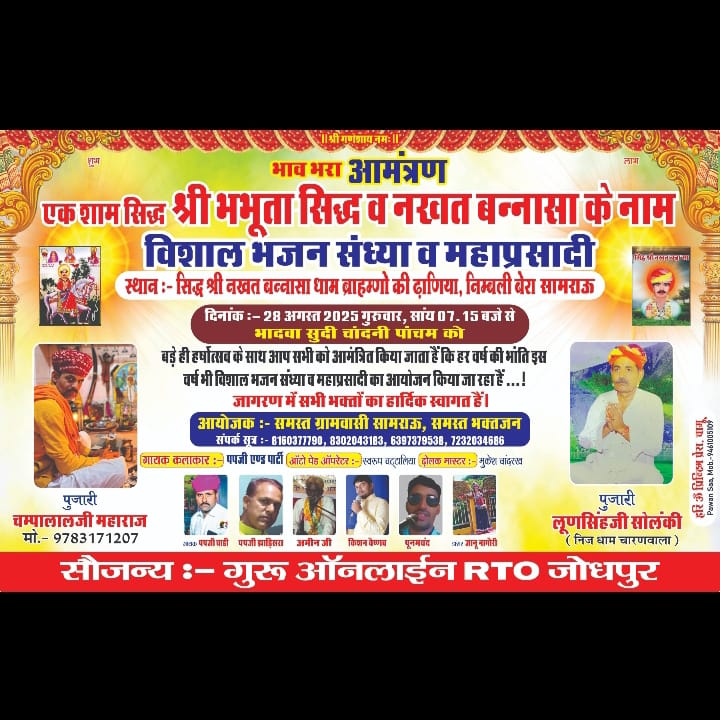 श्री नखत बन्ना जागरण भव्य कार्यक्रम पूर्वी भली भांति हर वर्ष की भाती इस बार भी भव्य कार्यक्रम आयोजित हो रहा है इस लिए एक श्याम बना के नाम अवस्य करे ज्यादा से ज्यादा आप जरूर पधारकर इस परोग्राम को सफल बनाएं